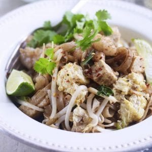 3. Heat the remaining oil in the wok, drain the noodles well and add these, tossing them around the pan until they soften then add the chilli flakes and pour in the tamarind sauce mix and stock and bring to a bubble, stirring and tossing the noodles as you go. Throw in the spring onions and half the beansprouts, toss around the pan until they wilt then add the egg, tofu and prawns to the pan and stir well to combine. Throw in the remaining beansprouts and stir well. Taste and add a squeeze of lime to your liking and top with coriander leaves to serve. Pile into dishes and dig in!