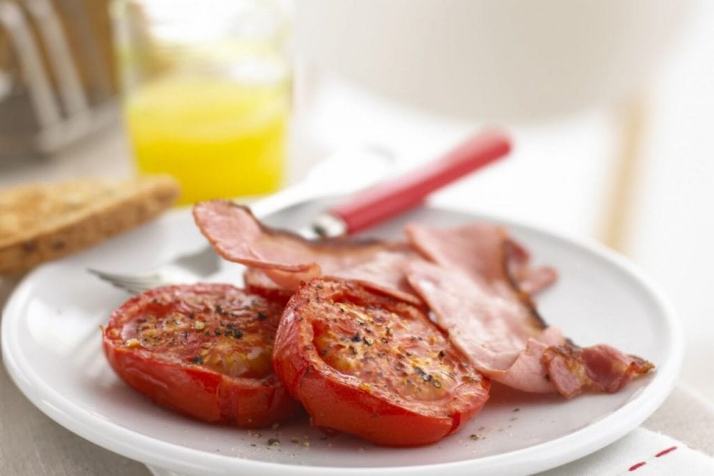 3. Transfer the tomatoes to a serving plate and top with the crispy bacon. Serve with wholemeal toast.
